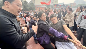 11月1日,校运会迎来收官之日。教师拔河赛率先拉开战幕,各队伍迅速列队,老师们紧握绳索、身体后倾,伴随场边师生的加油呐喊全力发力。