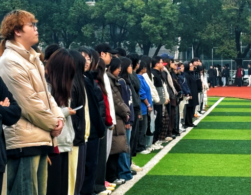 讲话结束后,全体与会人员齐声合唱《歌唱祖国》,激昂的歌声在操场回荡,传递着艺术学院师生对祖国的深深眷恋与对未来的满满信心。